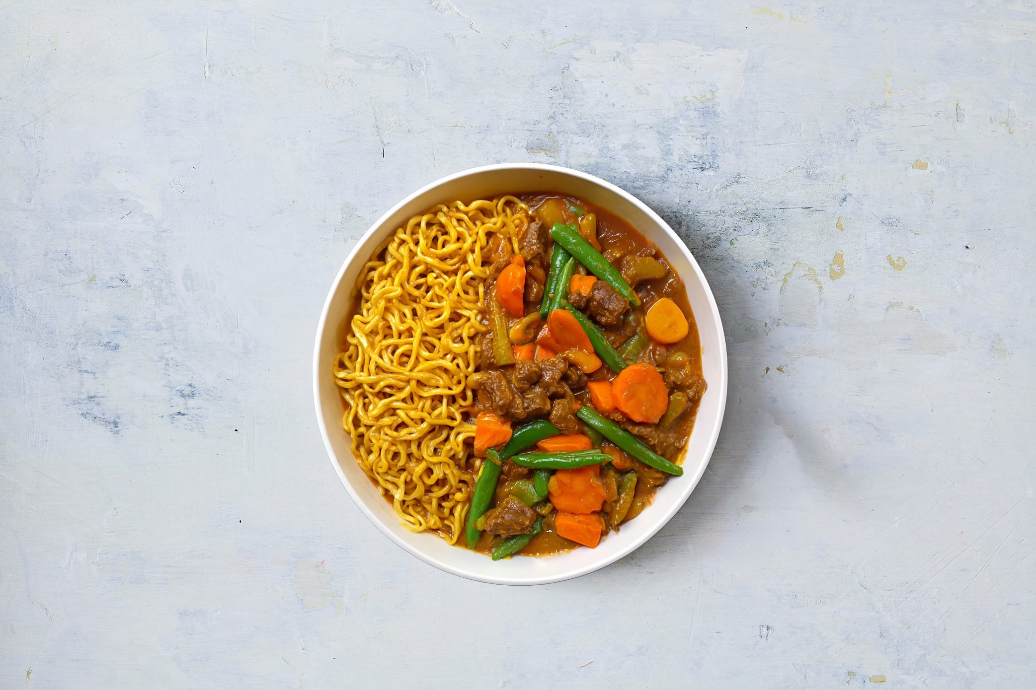 Vegetables (33%) (Beans, Carrots), Sauce (24%) [Water, *Peanuts*, Sugar, *Peanut* Paste, Coconut Milk Powder (*Milk*), Tomato Paste, Red Curry Paste (*Crustacean*), Canola Oil, Onion Powder, Thickener (1442), Garlic Puree, Curry Powder (*Gluten*), Mineral Salt (451)], Cooked Beef (22%), Hokkien Noodles (21%) [*Wheat* Flour, Water, *Gluten*, Salt, Vegetable Oil, Natural Colour (160a)].